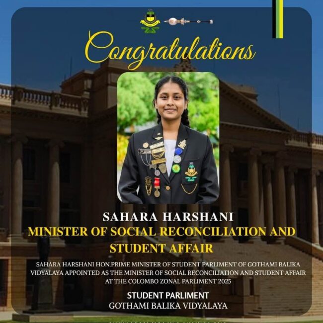 We are proud to congratulate “Sahara Harshani”, Hon. Prime Minister of the Student Parliament of Gothami Balika Vidyalaya, on being elected as the Minister of Social Reconciliation and Student Affairs at the Colombo Zonal Student Parliament. This achievement shows her dedication, leadership and passion for creating unity among students. The entire Gothami Balika Vidyalaya community…